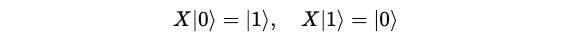 This means that when the gate acts on a qubit in state |0>, its state is flipped to |1> and vice versa.