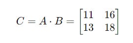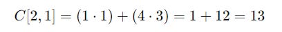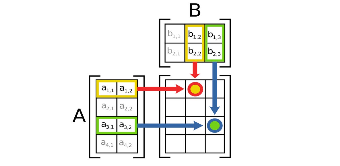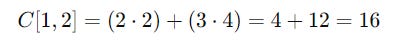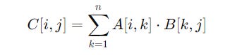 C[i, j]is the element in thei-th row andj-th column of the resulting matrixC.A[i, k]is the element in thei-th row andk-th column of matrixA.B[k, j]is the element in thek-th row andj-th column of matrixB.The products of corresponding elements in the row of