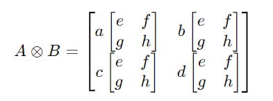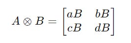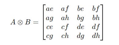 Given two matrices A and B of size m × n and p × q respectively, their tensor product A ⊗ B results in a matrix of size (m ⋅ p) × (n ⋅ q).