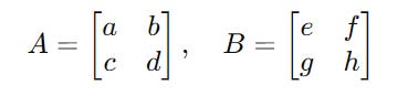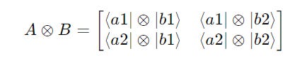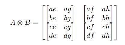 The tensor product (or Kronecker product) of two matrices combines them into a larger matrix.