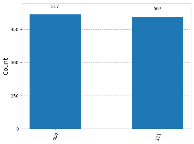 # Counts: {'111': 507, '000': 517}We run the simulations for 1024 independent shots. The counts value represents how many times each outcome occurred during these shots.