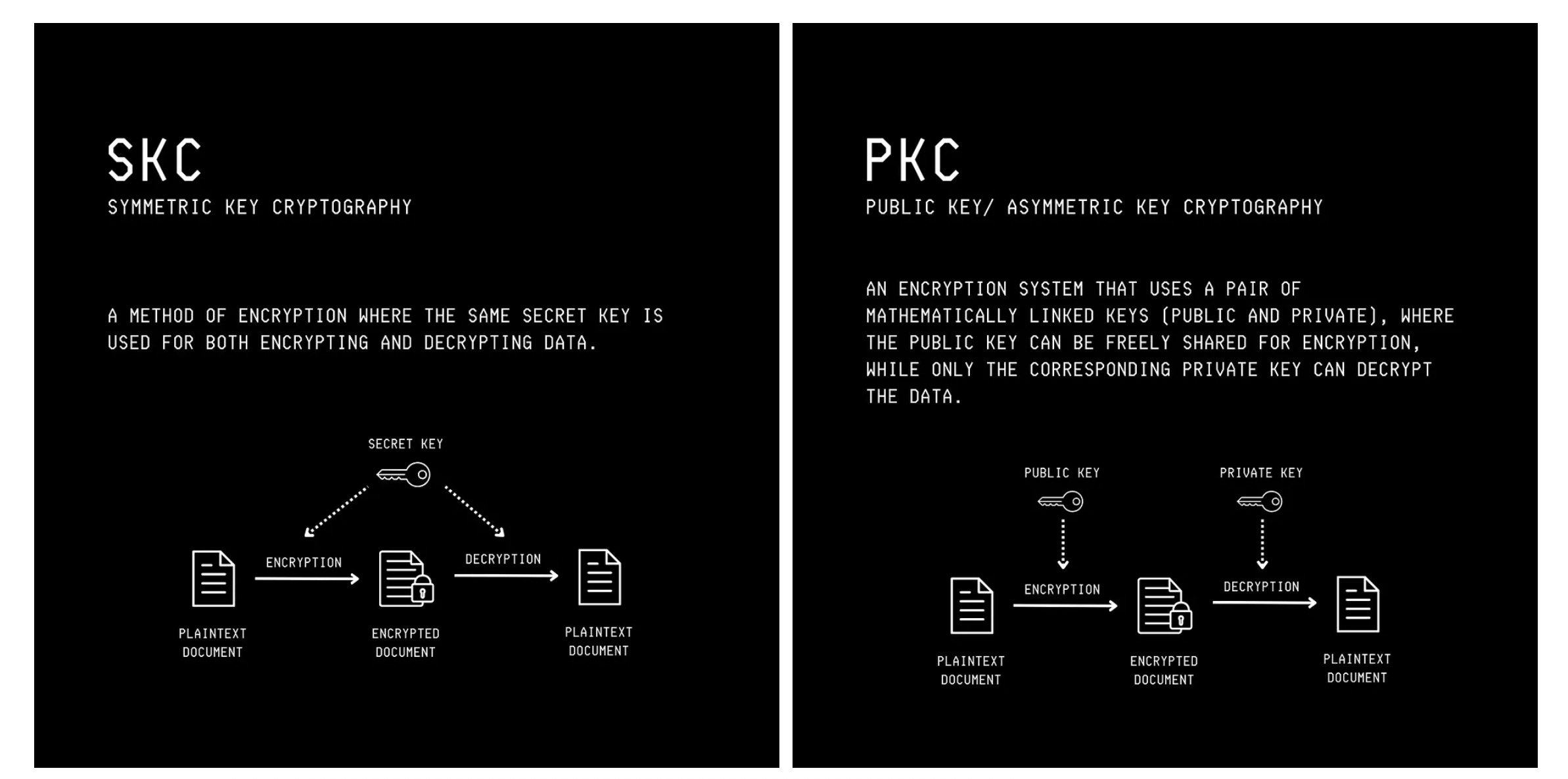 2. Public/ Asymmetric key cryptography: where two different keys are used. A public key is available to everyone for encryption, and a private key is kept secret for decryption of messages.