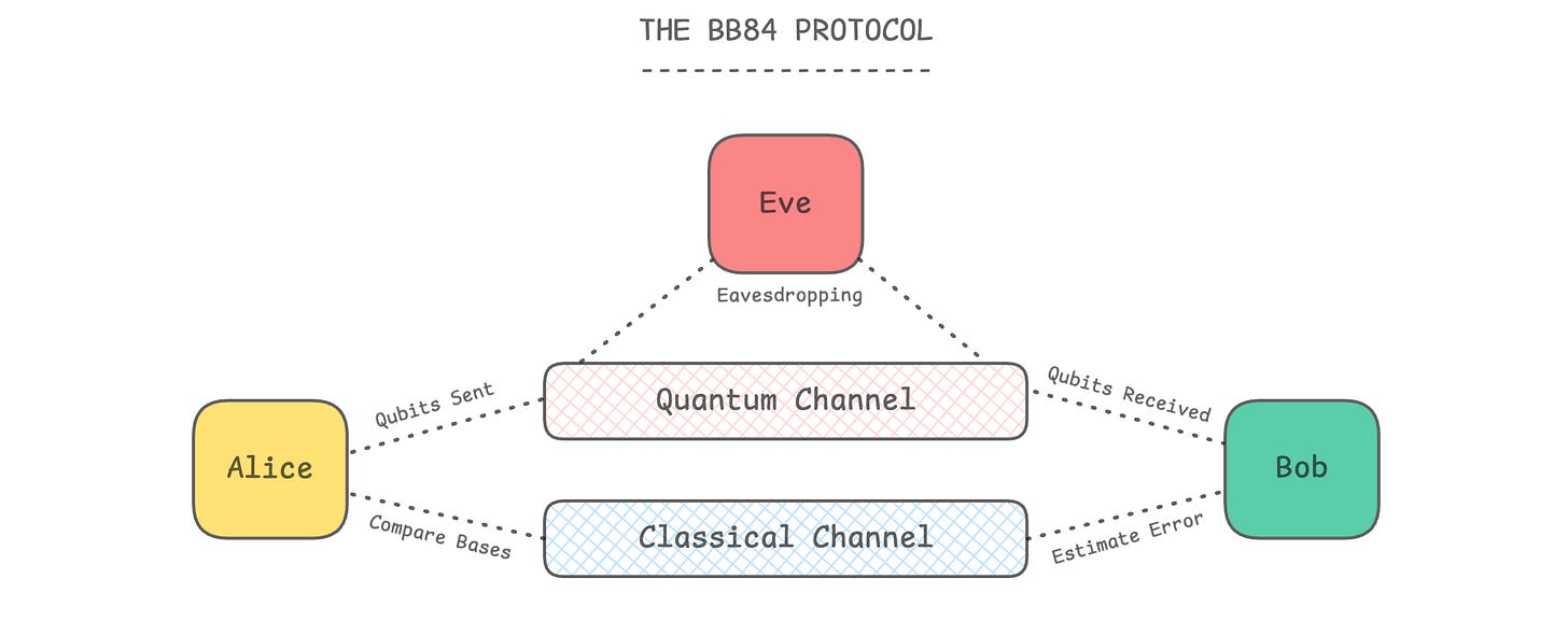 A deep dive into the BB84 protocol, a quantum key distribution protocol that lets two parties share a secret key for secure communication.
