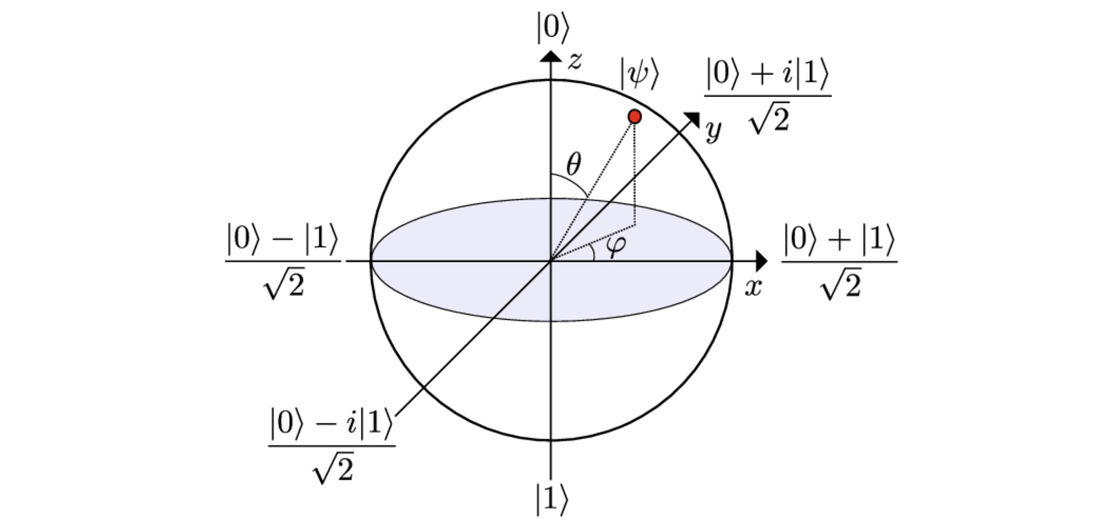 The north (positive Z-axis) and south (negative Z-axis) poles represent the basis states