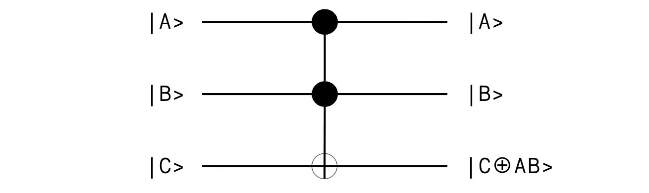 (|C>, previously|0>, is flipped because both control qubits|A>and|B>are|1>.)