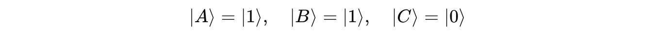 Consider the three qubits |A>,|B>,|C> again, which represent the inputs to the gate: